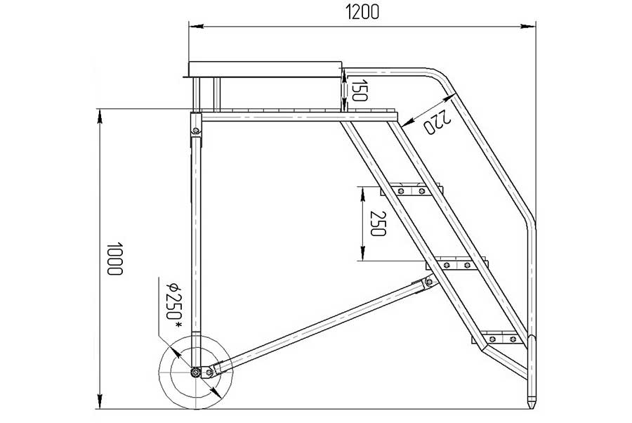 Колёсная база – 2÷4 колеса, расположенные на крайних углах рамы. Диаметр колёс 250 мм, и механизм крепления позволяет быстро и эффективно перекатывать стремянку к следующей рабочей точке.