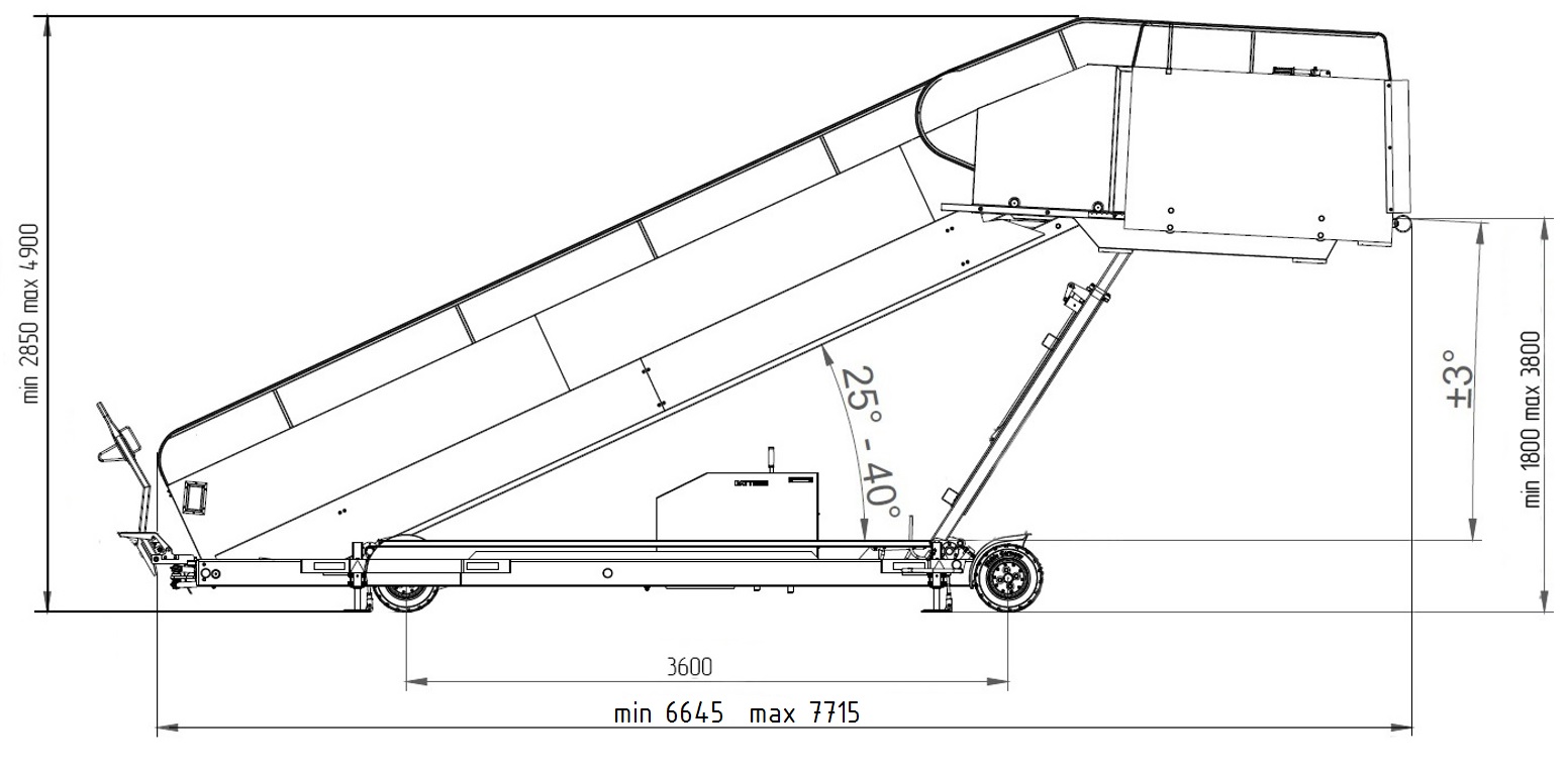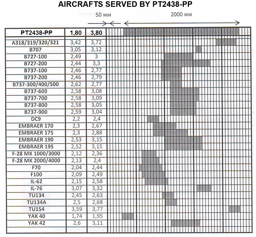 Пассажирский трап ПТ2438-ПП-03 предназначен для удобного входа и выхода пассажиров с борта самолета, двери которого оборудованы порогом, высотой от +1,8м до +3,8м, измеряемой от аэродромной плиты. Трап изготовлен в соответствии с климатическими условиями для работы при температуре окружающей среды от -40°С до +40°С. Рама шасси трапа сконструирована из стальных П-образных профилей. Прочность выполненной таким образом конструкции надежно обеспечивает безопасность пассажиров.