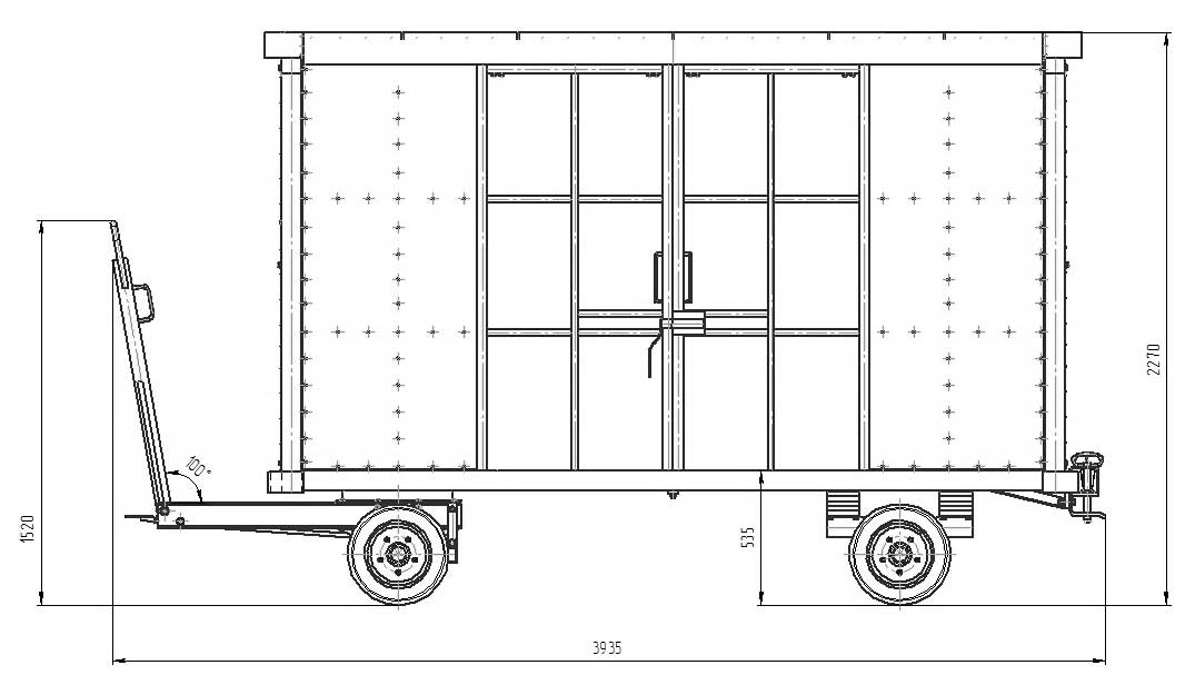 По типу конструкции тележка представляет из себя фургон на базе прочной стальной рамы на четырех колесных опорах.