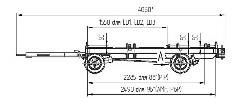 Колеса спаренные – 8шт, гусматик. Тип 4.00-8. Передние колеса поворотные, а задние -неповоротные.